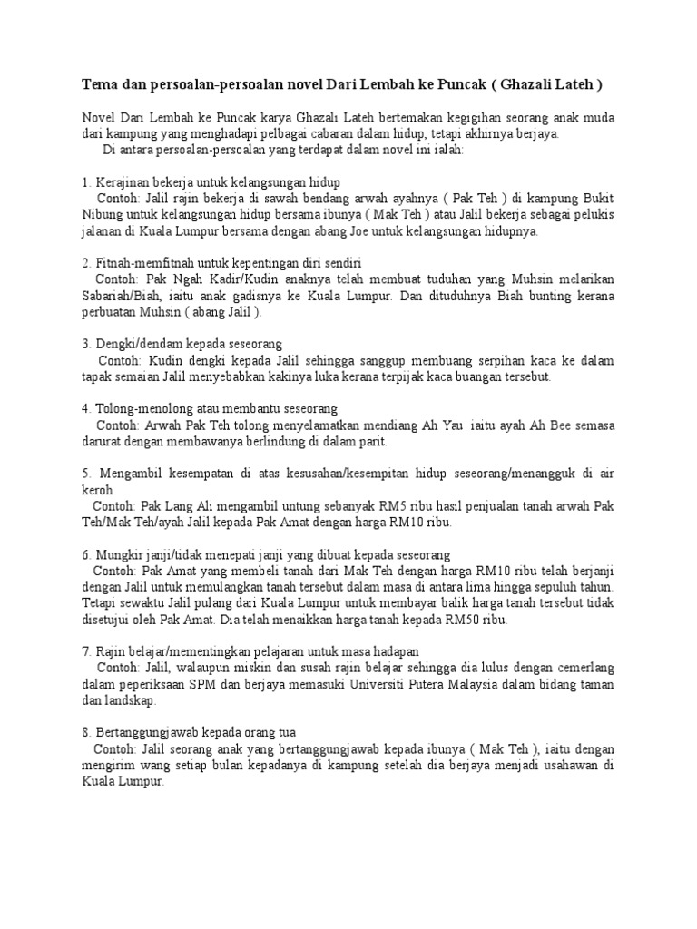 Semoga perkongsian nota-nota rujukan bahasa melayu contoh-contoh karangan bahan-bahan pembelajaran dan pengajaran PT3 Pentaksiran Tingkatan 3 tingkatan 1 tingkatan 2. Novel BM Bahasa Melayu Tingkatan 2 PT3 Pentaksiran Tingkatan 3. Sinopsis Tema Persoalan Watak dan Perwatakan Latar Masa Latar Tempat Latar Masyarakat Nilai Murni Pengajaran Teknik Penceritaan Novel Jalan ke Puncak.